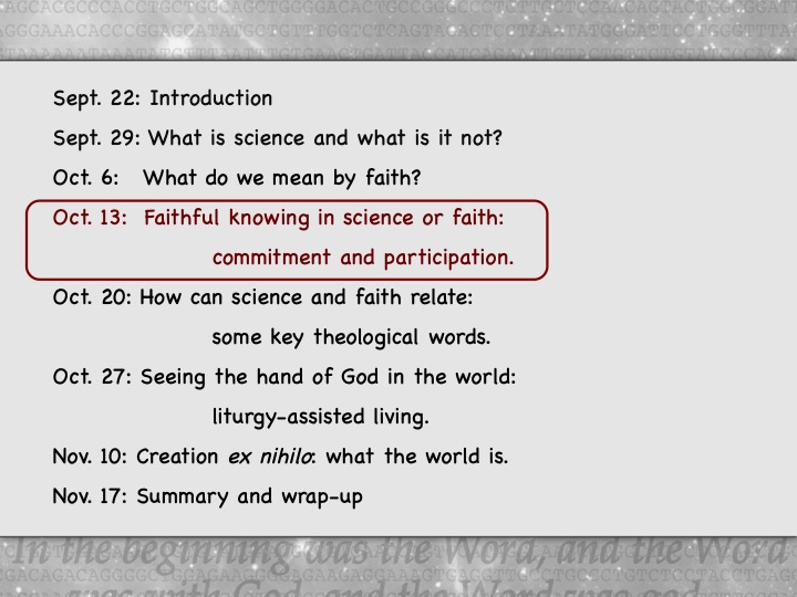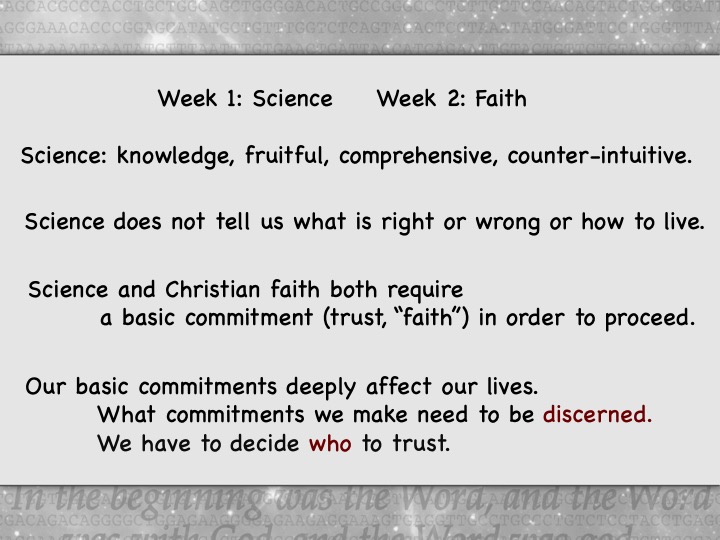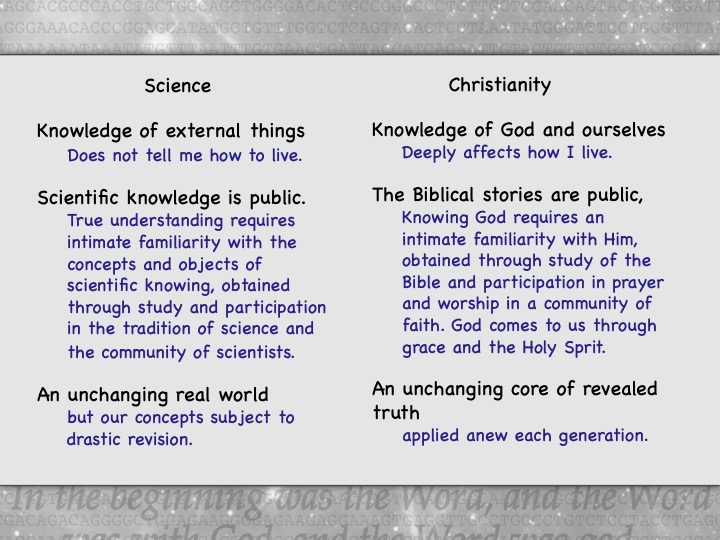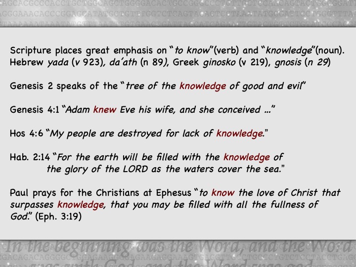 Scientists are passionate about knowing about the world, what it is like, how it works (Feynman). Scripture places great emphasis on “knowledge” of God (Hebrew yada, da’ath, Greek gnosis). Paul prays for the Christians at Ephesus “to know the love of Christ that surpasses knowledge, that you may be filled with all the fullness of God.” (Eph. 3:19)
