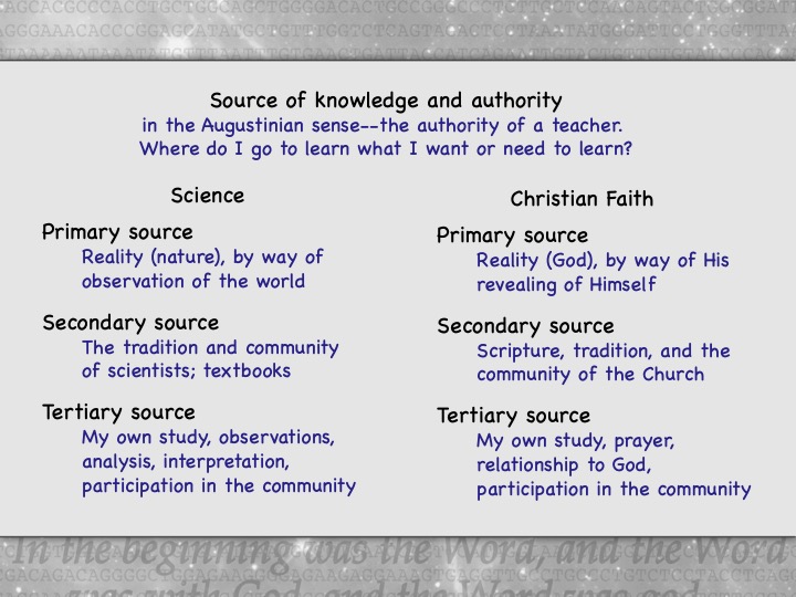 Our knowledge of the world, whether in science or Christian faith, comes to us through a basic three-fold structure. What is the source of authoritative guidance? Where or to whom do I go to learn what I want or need to learn?