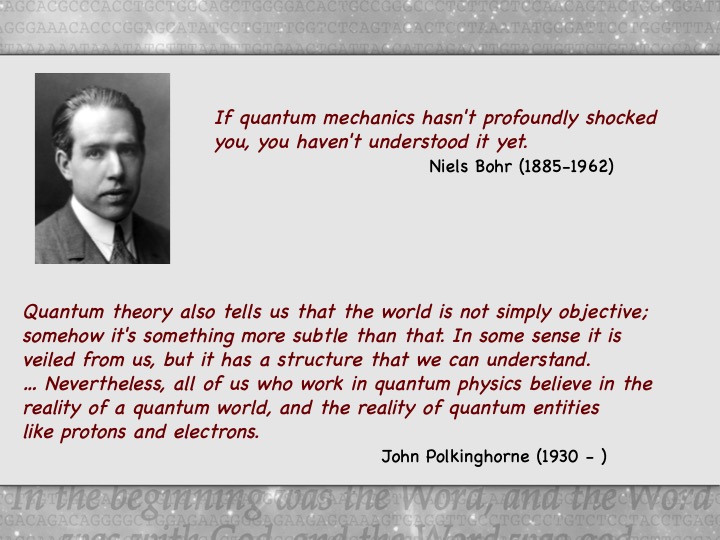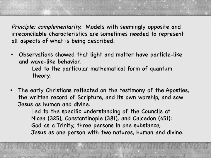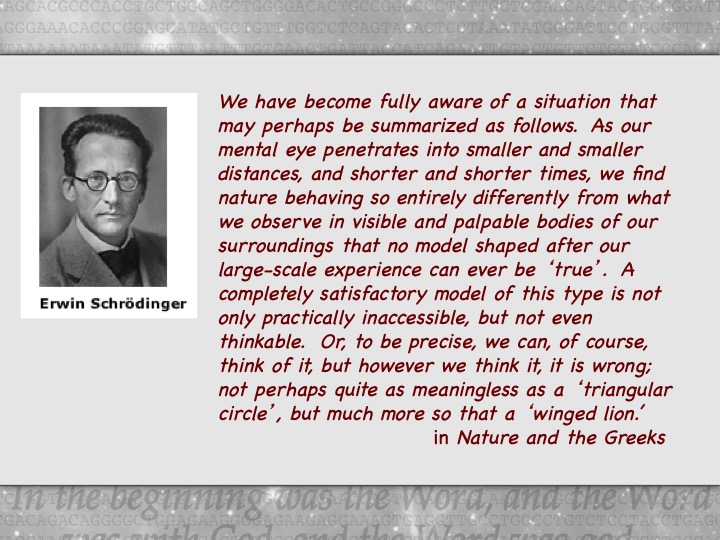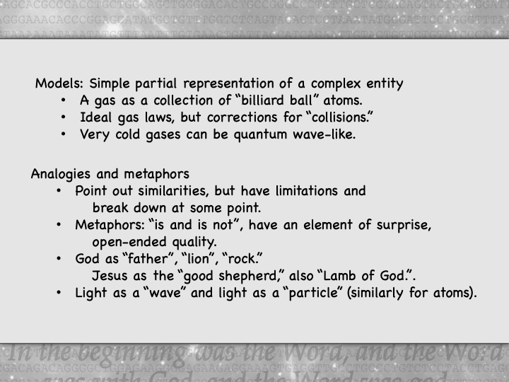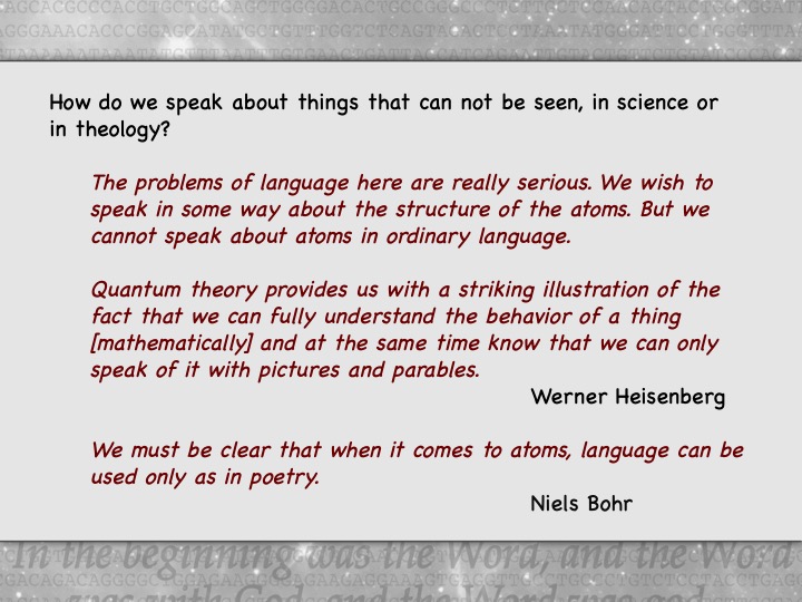 How does one represent entities that cannot be directly seen, such as electrons or other elementary particles? In science we observe phenomena over a vast range of space and time. In religion, we use concepts such as God, forgiveness, or eternal life. What kind of language must be used to talk about such things? Werner Heisenberg (1901-1976), one of the founders of quantum physics, said “The problems of language here are really serious. We wish to speak in some way about the structure of the atoms. But we cannot speak about atoms in ordinary language.” We need language adequate to its task.