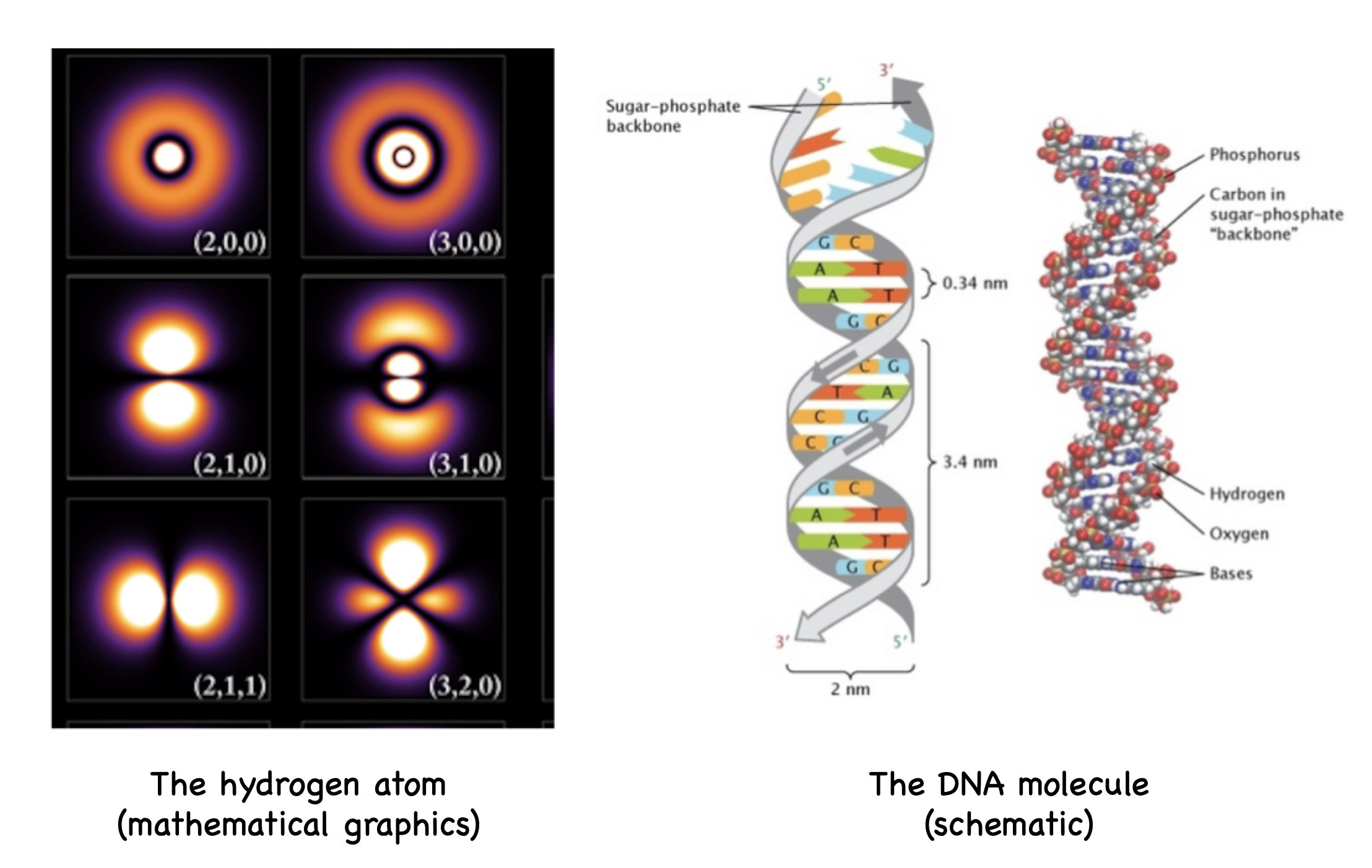 The ideas of “form” and “formal cause” actually makes much sense in contemporary physics. The equations of natural laws (known by science and expressed through “formal” mathematics) represent the form given to matter, which in turn conforms to the equations. No “matter” exists in modern physics that is not already so “informed.” It would not seem odd to a modern physicist to think of all matter as being “dressed by form.” Quantum fields are manifestations of form. Form inheres in all things. The “form” provides the “formal cause” of a thing. Illustrations of form discussed in the class included the hydrogen atom (the simplest atom) and the DNA molecule, both of which exhibit enmattered form.