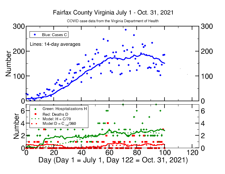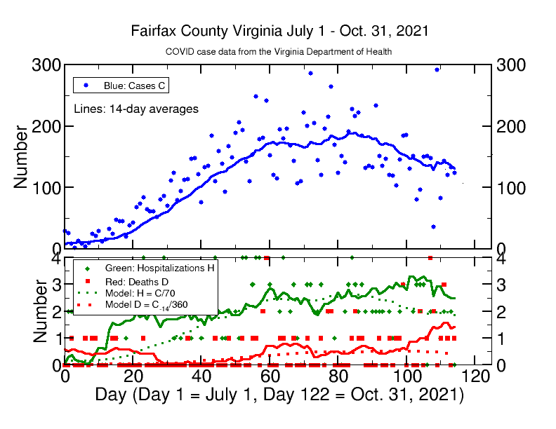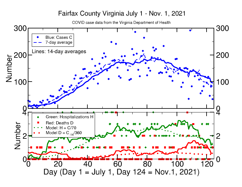 Now that the data for all of October is available for Fairfax, my Covid update continues to be good news. Cases continue to fall, with the 7-day average now around 84 (slightly less than the 14-day average). While there had been an increase in hospitalizations and deaths starting a few weeks ago, the last week or two has seen a clear downturn in these such that the current values are back in line with my new model predictions. Probably the increase was due to lingering cases from the peak of the surge in late September. Fairfax continues to be better than national rates on all counts.