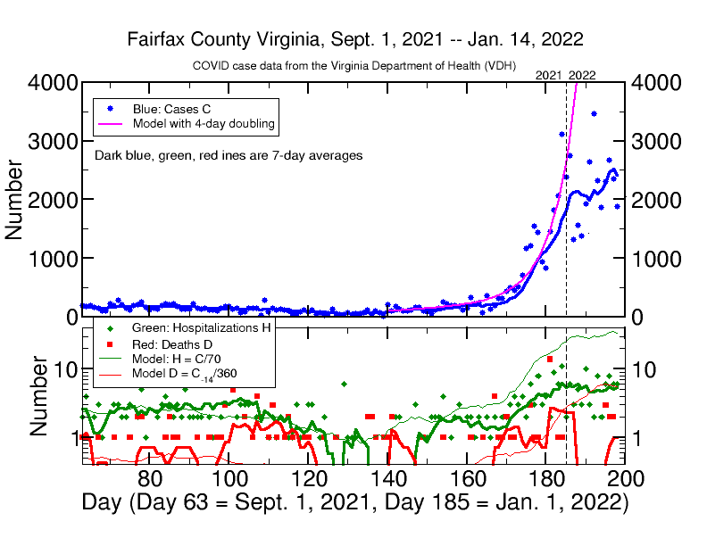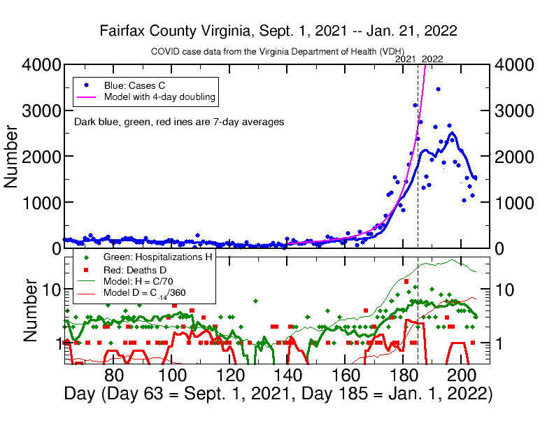 The hospitalization and death rates for Fairfax County are MUCH better than in most parts of the USA, where daily hospitalizations are around 1 in 30 cases (28,000 new daily admissions for around 700,000 daily cases) and the death rate is around 1 in 350 cases (2000 daily deaths in around 700,000 daily cases). The strangely high hospitalization rate (1 in 30 cases), which is similar to the high rate we saw in Fairfax in 2020, suggests to me that cases in the USA as a whole are likely being significantly undercounted, that is, there likely are a million or more unreported daily cases which are needed to account for the number of nationally reported hospitalizations.