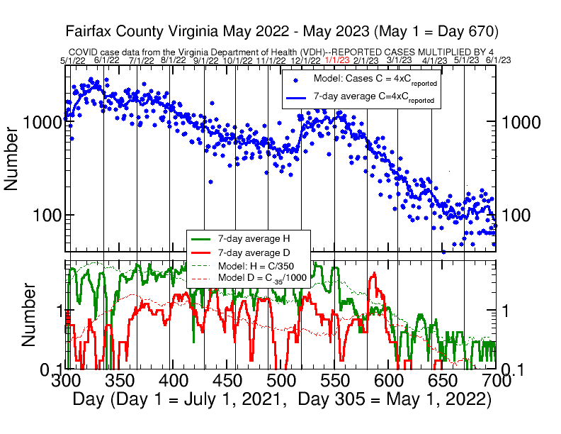 This update on Covid-19 data for Fairfax County covers over a full year from May 1, 2022, through May 31, 2023. Cases continue to drop since declining from the peak in May 2022 with a half-life of around 2 months until a doubling of cases in December 2022, followed by a decline with a half-life of around 1 month since the start of 2023 through April. Cases seem to be leveling off in May, with a slight increase followed by a slight decrease. There are only around 100 estimated cases per day in Fairfax now (to compensate for untested cases or home tests only, my model assumes the actual case rate is four times the reported number of positive PCR tests, now averaging around 25 per day). Daily hospitalizations and deaths continue to decline. My model assuming a hospitalization rate of one in every 350 cases remains fairly accurate on hospitalizations, predicting close to the current average reported rate of 1 new hospitalization every 3 days. While my model predicts a very low death rate of 1 every 14 days or so, trending downwards, the actual death rate is much lower than that: there was only one reported Covid death in Fairfax County in the entire month of March, only one in April, and none in May. Therefore, Covid is having a relatively negligible impact in Fairfax right now, consistent with the trend over the past few months.