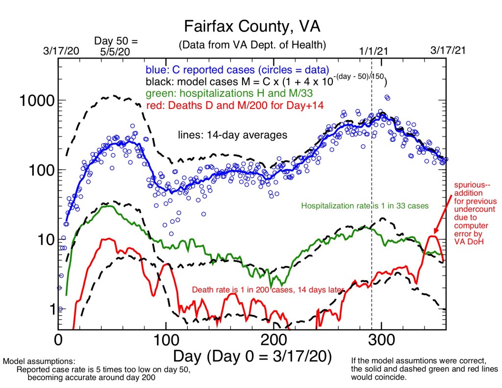 My model M is very simple (the formula is on the graph): I assume that cases were undercounted at first, by a factor of 5 at Day 50 (May 5, 2020) improving exponentially to being accurate around day 200 and after. With this model M of actual cases (top black dashed line), the hospitalization data (green line) are accounted for fairly well by assuming a constant hospitalization rate of 1 in every 33 actual cases. Similarly, the death data (red line) are explained by a death rate of around 1 in 200 actual cases, peaking 14 days after case onset. These H and D rates are consistent with similar values from other sources, with the H and D rates in Fairfax being on the low side of those from other parts of the USA or abroad.