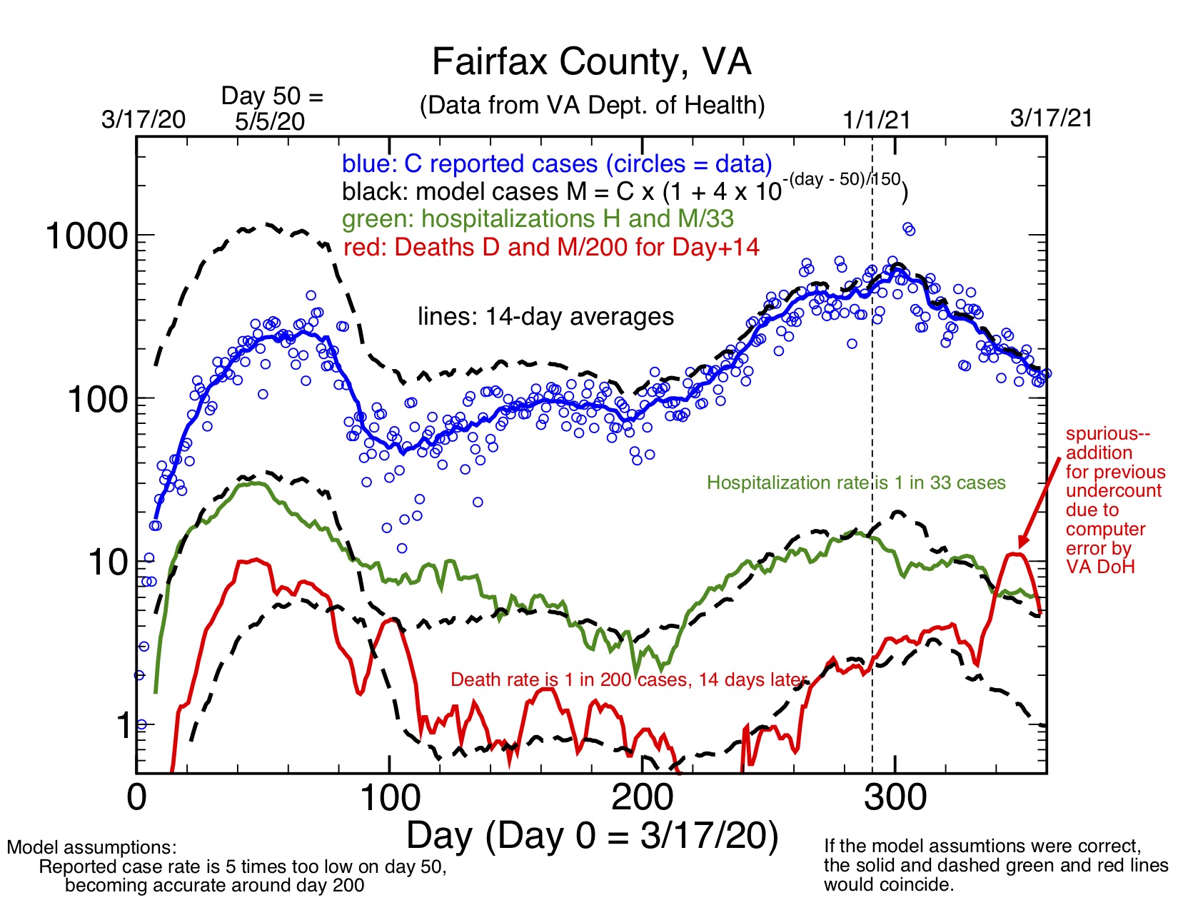 My model M is very simple (the formula is on the graph): I assume that cases were undercounted at first, by a factor of 5 at Day 50 (May 5, 2020) improving exponentially to being accurate around day 200 and after. With this model M of actual cases (top black dashed line), the hospitalization data (green line) are accounted for fairly well by assuming a constant hospitalization rate of 1 in every 33 actual cases. Similarly, the death data (red line) are explained by a death rate of around 1 in 200 actual cases, peaking 14 days after case onset. These H and D rates are consistent with similar values from other sources, with the H and D rates in Fairfax being on the low side of those from other parts of the USA or abroad.