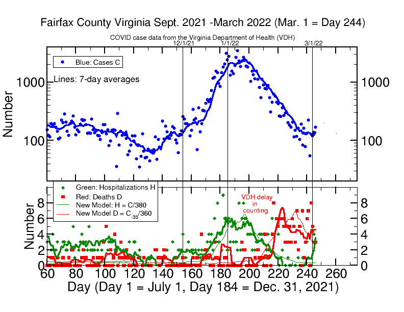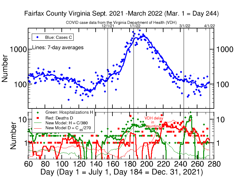 The graph shows the status of Covid-19 in Fairfax County Virginia at the end of March, 2022 (see Section below for an analysis given at the beginning of March). Cases C have leveled off around 100 cases per day, and may be showing a slight increase near the end of March. Daily hospitalizations H have been tracking the new rate of 1 H for every 380 cases (153 H out of 59133 total C so far in 2022), with the exception of an unusual spike in early March. The H data for February and March have shown both the spike and a large subtraction in previously recorded cases, so this later data after the Omicron peak in January may reflect the addition or subtraction of earlier hospitalizations as VDH re-evaluated earlier data to ensure accuracy. In any case, the current (March 31) average H rate of around 1 H per day seems a bit high compared to current cases. It is very clear that deaths D have tended to peak around 5 weeks after case onset. Oddly, the death rate that accounts for the data in February and March corresponds to around 1 death for every 270 cases (222 deaths out of 59133 cases in 2022). This is not as good a death rate at it appeared in January, where most deaths from Omicron variant had not yet occurred because of the 5 week average delay between onset and death. The current death rate is also around 1 per day in Fairfax County. Oddly, the number of deaths in 2022 have exceeded the number of reported hospitalizations. The death and hospitalization rates in Fairfax both remain relatively low now, around 1 per day, subject to statistical variation. I do not know to what extent the current H and D reports reflect updating and correcting earlier data; this seems to be ongoing, since some days report negative H events due to removal of earlier events.