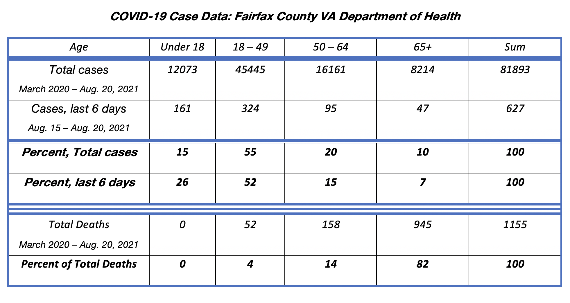 In Fairfax, 1 in 9 people over 65 who got COVID-19 died from it (945 deaths out of 8214 cases). It is very dangerous to get COVID-19 if you are over 65. Vaccines will cut the danger, but I have not seen data that quantify it yet for the recent Delta surge. But if you take the 47 cases for the 65+ age group in Fairfax in the last 6 days and say that 1 in 9 will die, that would be a death rate of around 5 per week, whereas we are only having around a total of 1 death per week now. So the odds are better than before. We should wait a few weeks to see, but let’s just guess that the death rate of vaccinated people over 65 in Fairfax my be much lower, closer to 1 in 50. That would correlate with 1 death per week if the case rate for 65+ in Fairfax stayed around 50 per week. I would guess that it is safer to be over 65 with COVID-19 in Fairfax than in Florida since our older people are probably getting much lower viral loads than older people in Florida due to better masking and other precautions.
