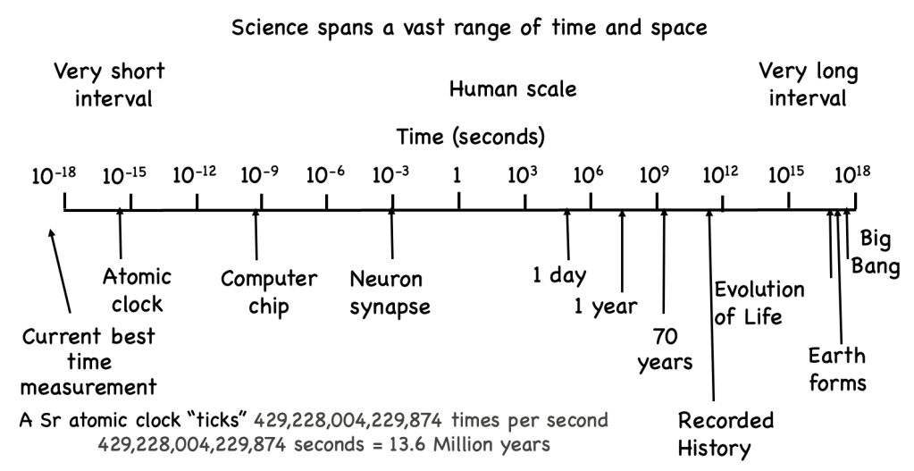 Some examples from contemporary physics illustrate the enormous range of scientific reason. First, Figure 1 indicates on a logarithmic scale of powers of 10 the scope of time that can be accessed using the best scientific instrumentation. This ranges from the cosmological scale of 14 billion years, roughly 44 thousand trillion (4×10+16) seconds, to the incredibly fast “tick rate” of the best optical atomic clocks, for example, the Sr clock that oscillates at a precisely measured rate of 429,228,004,229,874 (429 trillion) times per second.[13] The knowledge we have about stars and galaxies comes to us from the light they emit and can interpret because we now know the quantum properties of each kind of atom that give it its own quantum “fingerprint” written in the light it emits. In an example of extraordinarily short time phenomena, the response of electrons to the light striking the retinal molecules in your eye occurs on a time comparable to only one “tick” of a Sr clock (2×10-15 seconds). Thus, comprehensible processes that affect current human life on earth, from the science of vision to the evolution of life as a whole, extend across the entirety of this vast span. When shown on a logarithmic grid, the human scale of seconds, minutes, or hours stands in the middle of this scientifically accessible range of more than 30 powers of ten. The basic laws of physics allow us to give a unified account of it all, even if there are still a lot of loose ends.