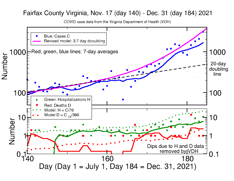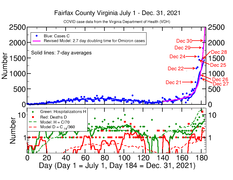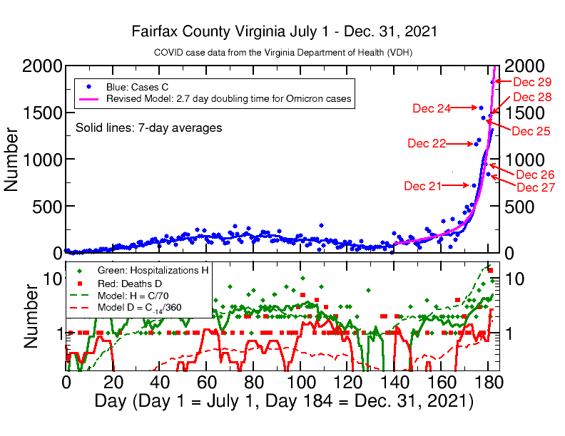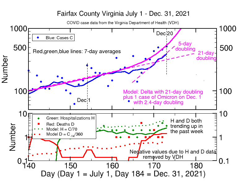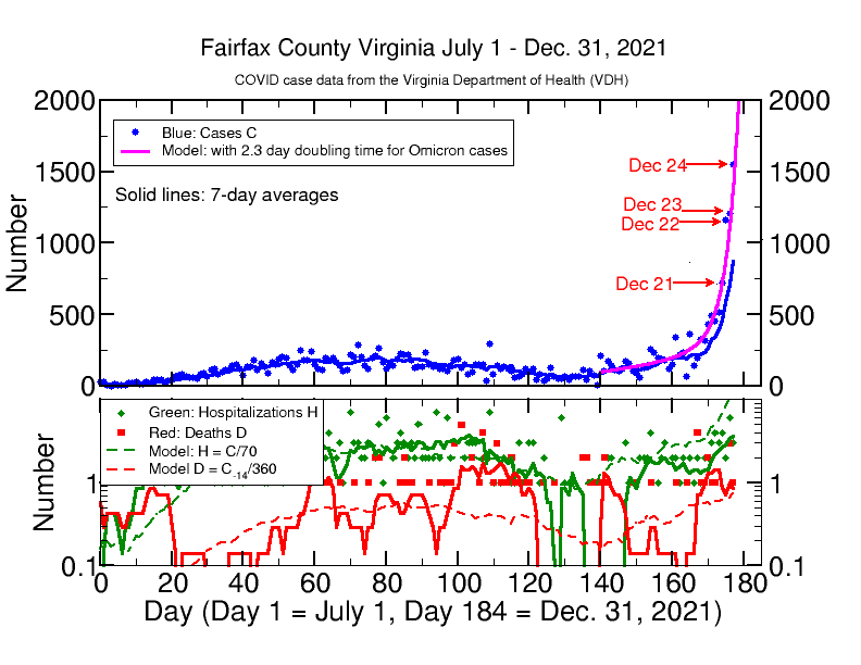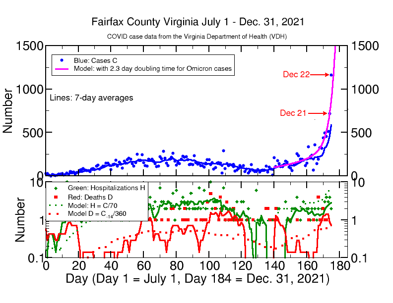 The Virginia Department of Health Covid case number for today, 1189, exceeds my model prediction of only 748 cases. I have adjusted the doubling rate to 2.3 days in the model on the graph below. This accounts for yesterday’s cases, but still falls short of today’s number. If this model is correct, Fairfax will have over 1800 cases on Christmas Eve, and we may have even more; we are not likely to be having less. The most cases ever in a single day in Fairfax was 1485 on Jan. 17, 2021, and the average daily number has never exceeded 750. If the model continues to apply, we will be having over 10,000 cases per day by New Year’s Eve. So far there is no exponential rise in daily hospitalizations H or deaths D. This is to be expected given the very rapid onset of cases, since there is a time lag between case onset and and H or D events, around 14 days for the D and probably a few days for H (I have not modeled that yet). So far D has remained around 1 per day and H has shown an increase from 2 per day to 3 or 4 per day. H and D are still “in the noise” of the statistical fluctuations of the data. I expect both soon to rise. See the analysis below.