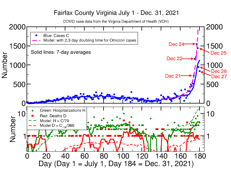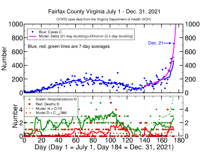 The graph below is like the ones in previous posts (see this for an overview, this for recent details, and this for a description of my former models). The upper panel shows confirmed (by PCR tests) cases since July 1 (blue dots) reported by the Virginia Department of Health (VDH). The solid line shows the running 7-day average of cases, which smooths out statistical variations. Since the middle of November, the case rate has been consistent with slow exponential growth with a 21-day doubling time. The data for the last 7 days show a new growth pattern with an approximate 5-day doubling of cases in the 7-day average (this will be more apparent in the log graph on my website). However, a 7-day average will smooth over faster growth rates. I can fit the actual case data with a very simple model with a faster growth rate. Please note well: it is only a model and certainly not the only possible model for explaining the high number of cases. While I hope it will prove to be wrong in its projections, it does seem realistic given the known properties of the Omicron variant. It is my intuition based on watching daily Covid-19 data for Fairfax and other places on a daily baisis for over a year and a half now that leads me to think that the model may be correct, at least for projecting increasing cases in the coming few days. Cases will eventually peak and start to decrease again at some unknown point in the future.